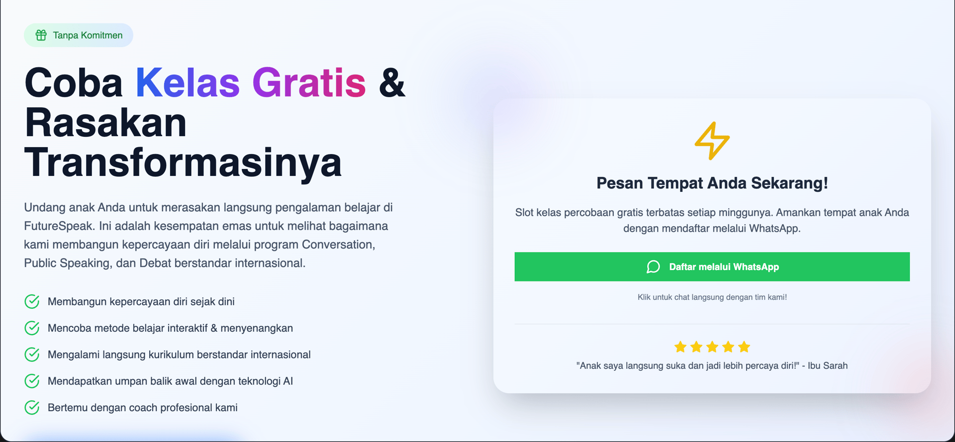 “Setelah bergabung di FutureSpeak, anak saya menjadi lebih berani tampil dan lebih terarah dalam menyampaikan materi. Cara mengajar Coach Kheydelix yang menarik juga membuat anak-anak lebih semangat belajar.”